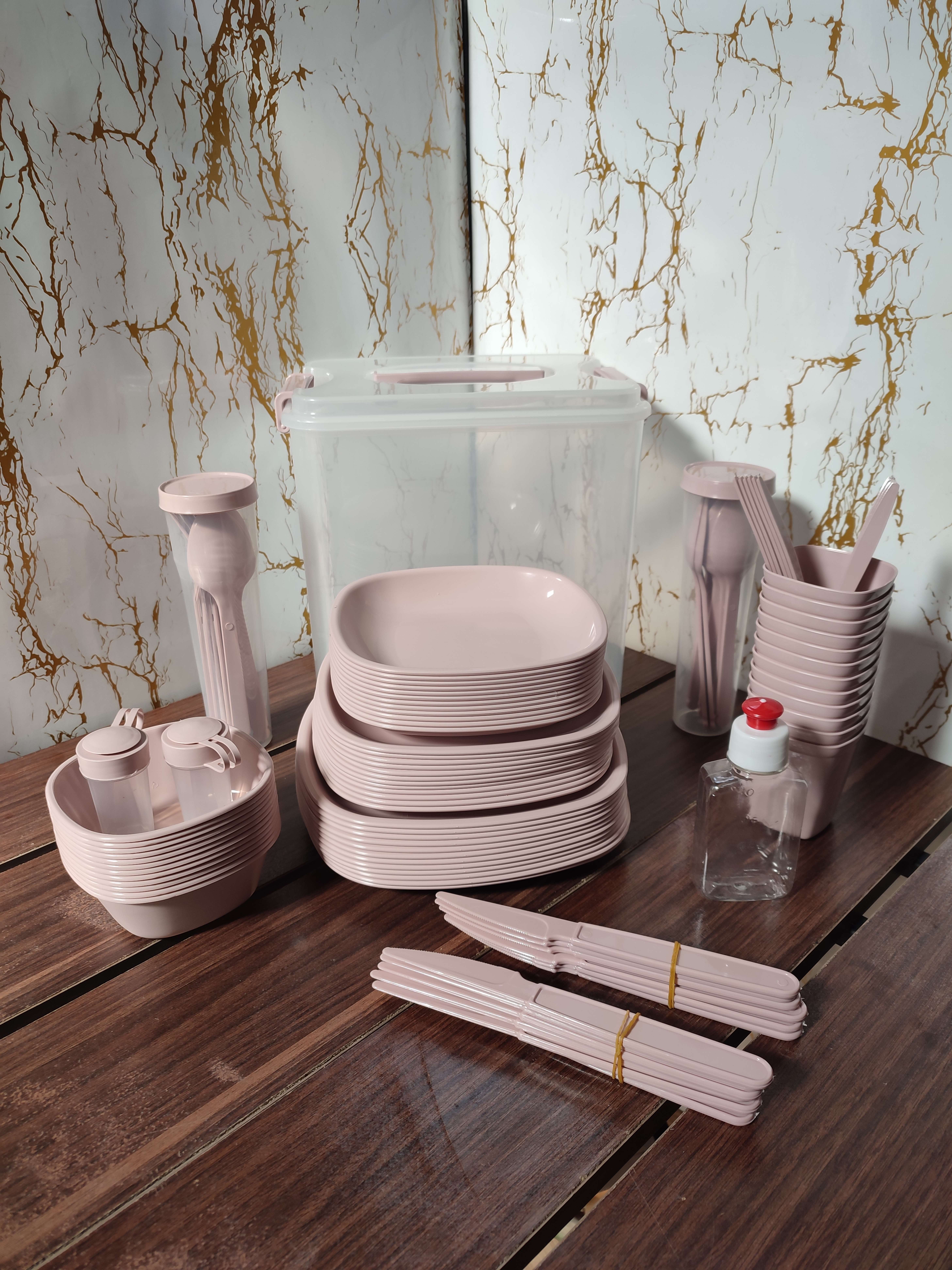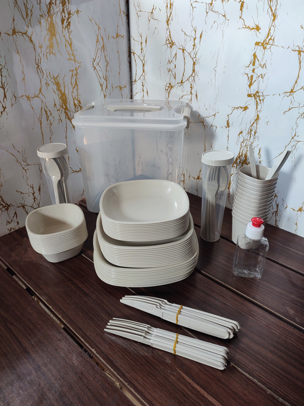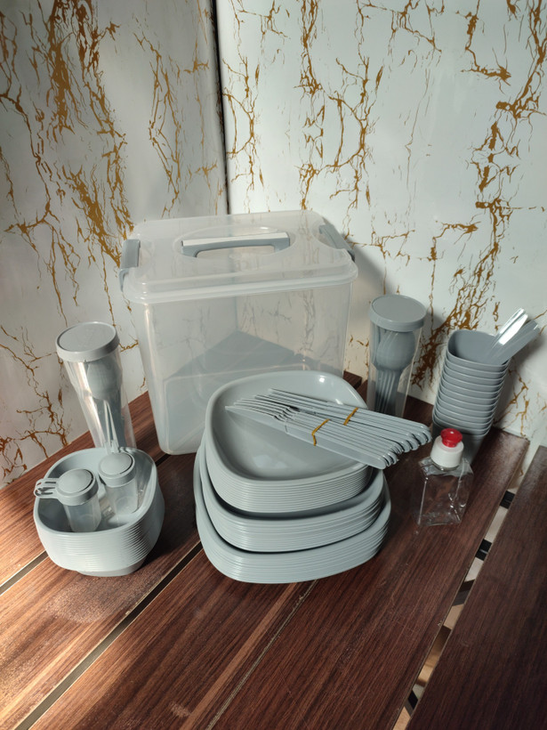 جنس پلاستیک درجه یک نشکن، سبک و مقاوم در برابر ضربه، گرما و سرما – بدون BPA، شستشوی آسان و بدون جذب بو. مناسب برای خانوادههای پرجمعیت، تورهای طبیعتگردی، کمپینگهای چندروزه یا حتی مهمونیهای فضای باز.