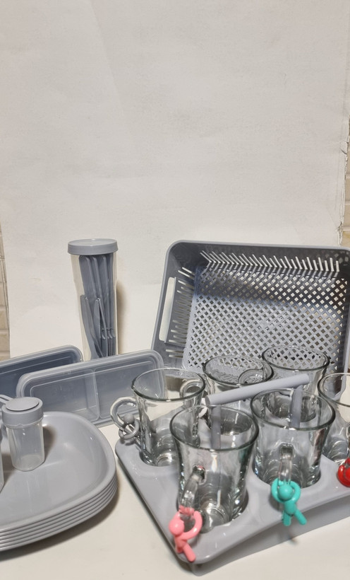 شامل ۶ عدد لیوان شیشهای دستهدار با عروسک نشان (آدمک)۶ عدد بشقاب مناسب نان، پنیر یا کیک، ۶ عدد قاشق مرباخوری ایدهآل برای مربا، عسل و کره و چای. ۶ عدد چاقو میوهخوری یا کرهکشی، ۶ عدد کاسه کوچک برای ماست، میوه یا تخممرغ، دو نمکپاش شیک، دو قندان برای شکر و نبات، و یک آبکش برای شستشوی میوه تازه در محل.